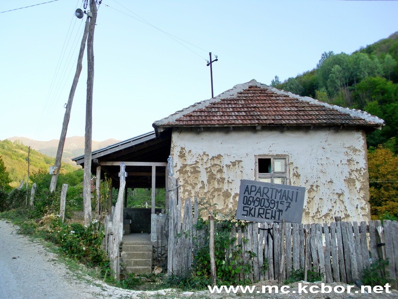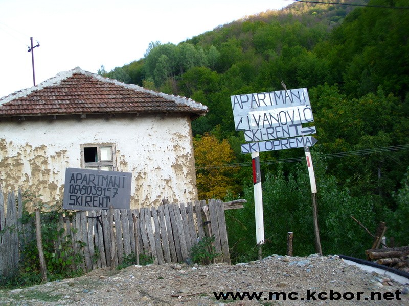Na ulazu u romantično staroplaninsko selo Crni vrh nalazi se i ovo, zanimljivo obaveštenje za turiste i namernike kako bi se odmorili u apartmanima. Ovaj znak stavljen je, očevidno, na lošem mestu, tako da se može pomisliti da je ova stara, oronula kuća-apartmansko “zdanje”. Ne, nije. Ispred ove napuštene kućice je mala, nova zgradica u kojoj su , reklo bi se na prvi pogled, dva, najviše tri apartmana. Malo podalje, u dolini je crkvica i više zgrada. Lepo, idilično mestašce.
