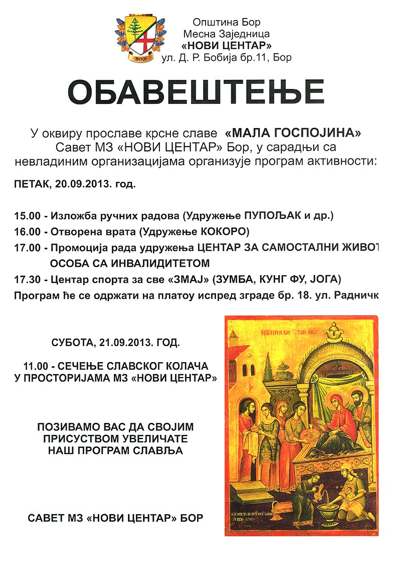 Današnjim rezanjem slavskog kolača sveštenika crkve „Sveti Đorđe“ i predsednika MZ „Novi centar“ Ivana Stojanovića, ovaj novi, veliki deo grada Bora sa više od 5.000 stanovnika, proslavio je svoju slavu Malu Gospojinu. Domaćinu Ivanu Stojanoviću i čalnovima Saveta MZ „Novi centar“ slavu su čestitali predstavnici Opštine, ostalih mesnih zajednica, od političkih organizacija SNS, SPS i DSS, ustanova i udruženja građana. Okupilo se oko stotinu gostiju koji su, uz slavske obrede, poželeli uspeh i zdravlje rukovodstvu MZ i svim žiteljima borske opštine.
