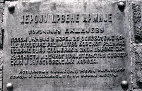 Sve do sredine sedamdesetih godina 20. veka, na ulazu u topionički krug, desno ispred kapije, nalazio se spomenik heroju Crvene armije, poručniku Akšajevu, koji je poginuo prilikom oslobađanja Bora. Neposredno posle Drugog svetskog rata on je ovde sahranjen, uz sopstvenu želju. Dugo su ovde razne delegacije boraca i gostiju polagale vence, a onda je nekome palo na pamet da grob treba preseliti. Tako je i urađeno, a prema našim saznanjima nije poznato gde su sahranjene kosti ruskog borca.