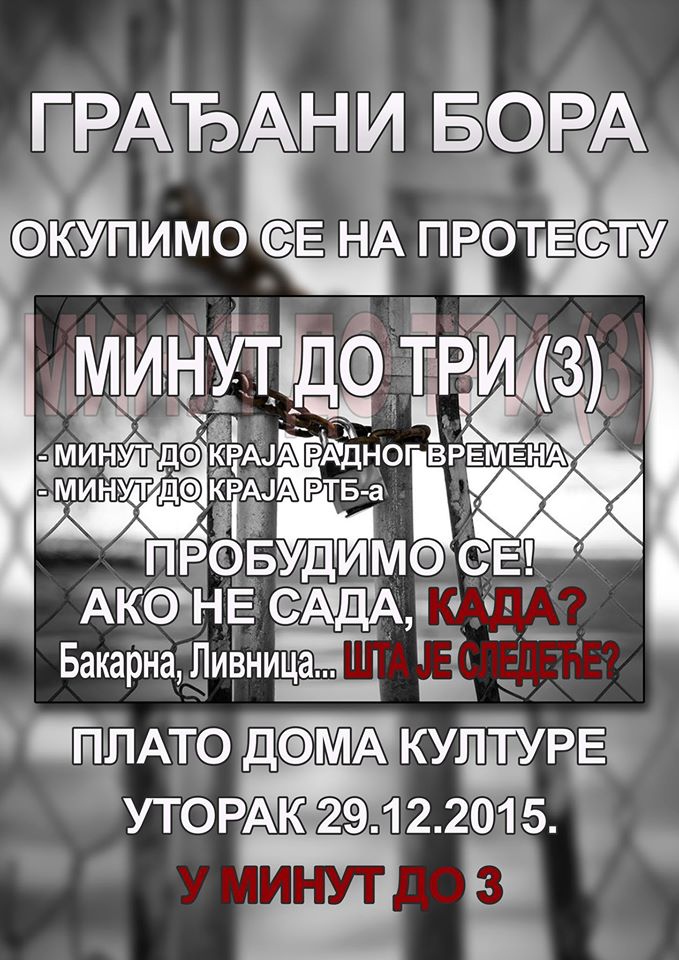 Protest će biti održan 29.12.2015. godine na platou ispred Doma kulture u Boru sa početkom u 14h i 59 min, a trajaće do 16 i 59 min.