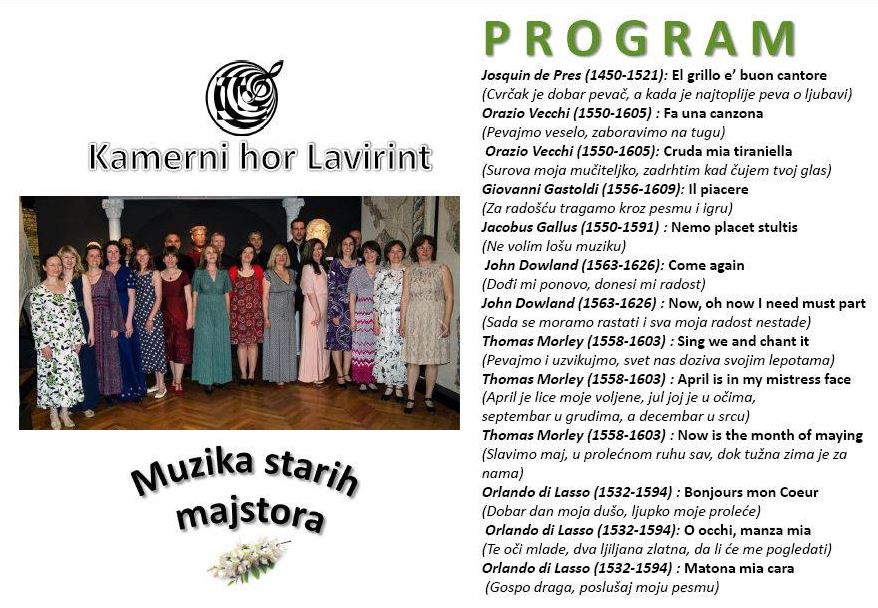 Kamerni hor Lavirint (Zaječar) izvodi koncert pod nazivom „Muzika sarih majstora“. Sreda, 20.05. 2015. Biblioteka Bor.