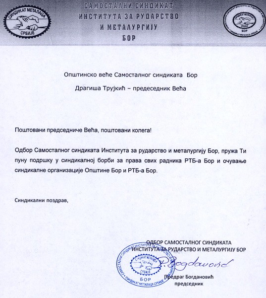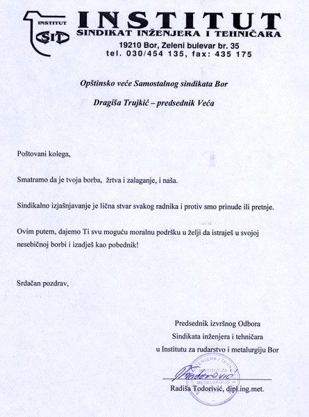 Podrška sindikata IRM Bor Dragiši Trujkiću