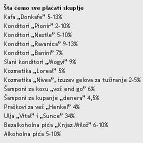 Kompanije „Donkafe”, „Pionir”, „Nestle”, „Nivea”, „Knjaz Miloš”, krajem prošle nedelje trgovcima su dostavile nove cenovnike više i do 13 odsto, a kao razlog za povećanje cena navele su kursne razlike i skuplje sirovine, piše današnji Blic.