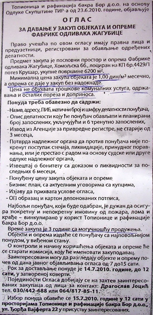 Zabrinuti smo situacijom koja se dešava u fabrici FOŽ Žagubice u kojoj se privatniku nudi kompletna fabrika sa pratećom opremom iako je u funkciji celokupne proizvodnje sa 6.200 m2 objekata koji se nude u zakup za 6.200 dinara ( 1 din/m2 mesečno ).