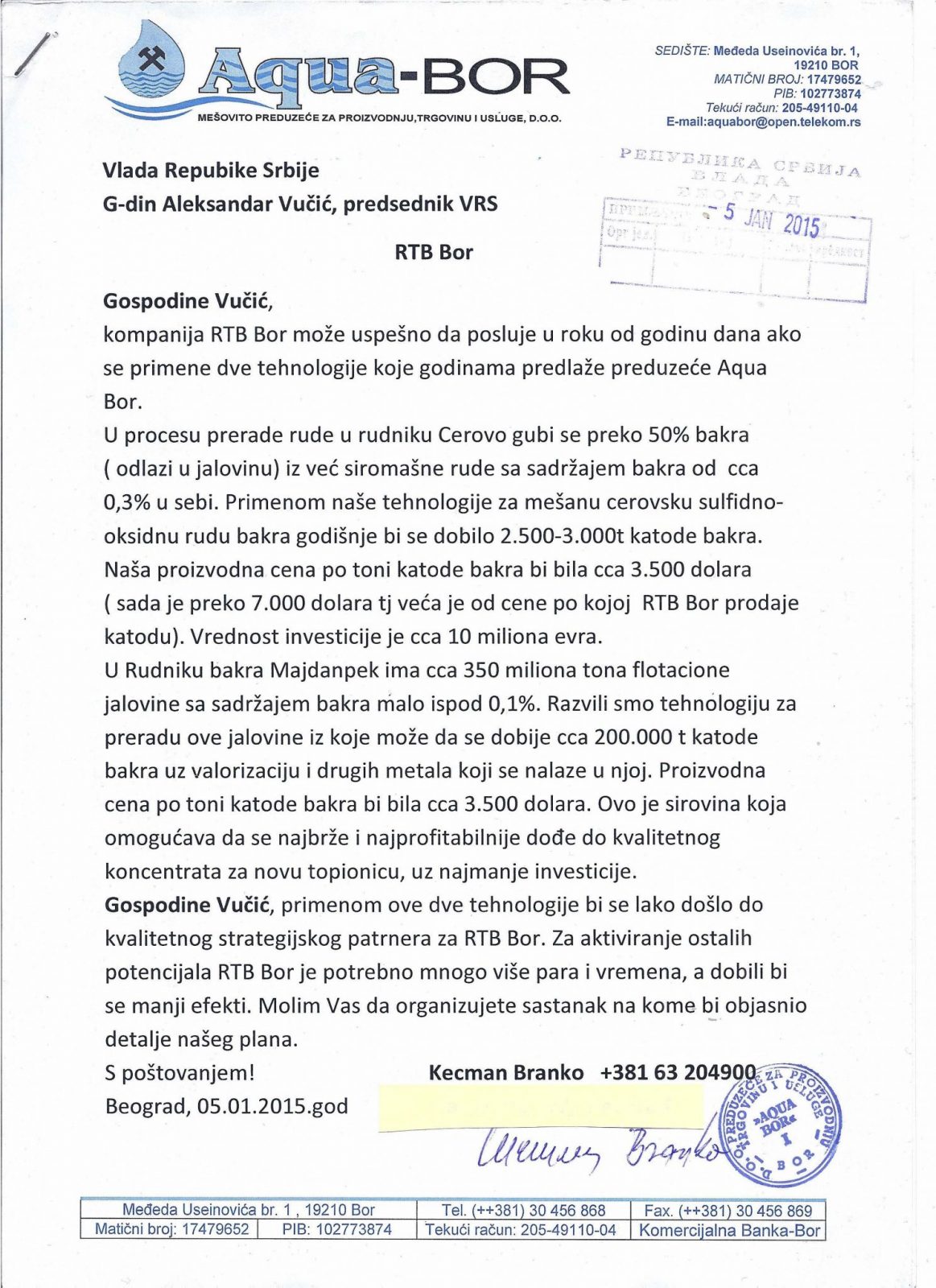 Firma Aqua-Bor ima svoju tehnologiju za tretman cerovske mešane sulfidno-oksidne rude bakra. Suština tehnologije je da mi odvajamo pre flotacije oksidni deo komponente bakra od sulfidnog dela; sulfidni ide na flotaciju a oksidni tretiramo našom metodom hidrometalurgije. Iskorišćenje bakra iz cerovske rude je kod nas preko 80%. Naša proizvodna cena po toni katode bakra iz oksidnog dela rude je ispod 3.000 dolara, pa se ostvaruje veliki profit. Nismo dobili ni jedan odgovor na mnoge dopise koje smo uputili RTB-u Bor povodom verifikacije i primene ove tehnologije u rudniku Cerovo. Treba pogledati dopise i mejlove koje smo uputili RTB Bor sa ponudom za saradnju. Bakar u vrednosti od preko 20 miliona dolara je otišao u jalovinu zbog neprimene naše tehnologije u ovom rudniku. Ovo se desilo zbog neverovatne neodgovornosti, bolesnog ega i totalne opstrukcije od strane generalnog direktora RTB Bor. Nije potrebna nikakva izmena u postojećem načinu prerade cerovske rude. Mi ubacujemo naš segment koji nikome ne smeta. Eksperti iz RTB Bor tvrde da nije moguće da se odvoji sulfidna komponenta bakra od oksidnog dela kako mi to tvrdimo, da to niko nije uradio na svetu. Naš odgovor je da treba samo potpisati ugovor sa RTB-om Bor da se zna da je to naša tehnologija i eksperimentom u Institututu za rudarstvo i metalurgiju u Boru dokazati da smo u pravu. Ne košta ništa RTB Bor, a može da mu priušti izuzetnu tehnologiju za mešanu sulfidno-oksidnu rudu.