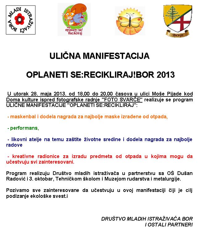 Početna / Vesti / Sutra ulična manifestacija „Oplaneti se. Recikliraj. Bor 2013.“AktuelnoVestiSutra ulična manifestacija „Oplaneti se. Recikliraj. Bor 2013.“27. maj 2013.Bor, 27. majDetalj sa prošlogodišnje ulične manifestacije „Oplaneti se. Recikliraj“Share this ArticlePrevious ArticleBor na korak od baraža: OFK Bor-Đerdap 1:0Next ArticleNajezda gubara u Negotinskoj krajinitehnicki urednikRelated Posts Javna diskusija o kvalitetu vazduha u Boru 22. oktobar 2025. Prestanak podrške za Windows 10 14. oktobar 2025. Spoji Dunav i umetnost: Postani Dunavski umetnik! 14. oktobar 2025.Ostavite komentarŽao nam je, da bi postavili komentar, morate biti prijavljeni.