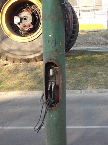 U zoni autobuskog stajališta „Tehnopromet“, u smeru prema gradu, tri stuba za javnu rasvetu povezana su elektirčnim kablovima sa kamionom. Način na koji je to obavljeno prikazan je na fotografiji.