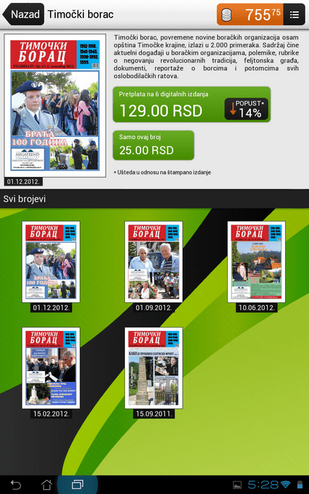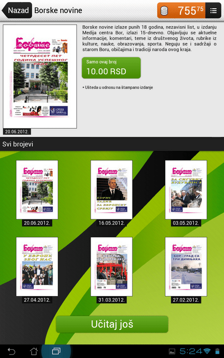 Na raspolaganju vam je besplatni sadržaj kao i sadržaj koji se plaća. Pre čitanja potrebno je da novine preuzmete na vaš uređaj. Aplikacija vam omogućava da čitate novine i kada niste na internetu. Izdanja koja ste pročitali možete da izbrišete da ne bi zauzimala prostor na tabletu ili telefonu i uvek ćete moći ponovo da im pristupite u vašoj biblioteci.