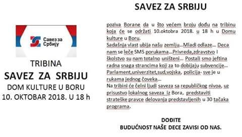 Gradski odbor Saveza za Srbiju u Boru organizuje tribinu na kojoj će učestvovati predstavnici članica Saveza za Srbiju na republičkom nivou.Učesnici tribine su: Dragan Đilas, Saša Paunović, Zdravko Ponoš, Boško Obradović, Nebojša Zelenović, Željko Veselinović i Borko Stefanović.
