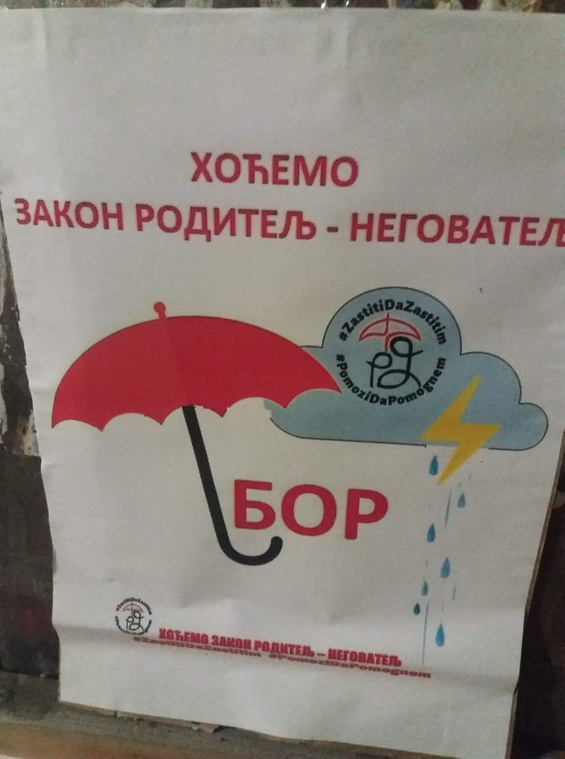 „ Kampanja #ZastitiDaZastitim #PomoziDaPomognem je počela iz Bora, u organizaciji UG Izbor postoji, a sada u kampanji aktivno učestvuje 37 gradova Srbije. Nakon lepljenja nalepnica sa logoom kampanje i deljenja flajera u svim tim gradovima, stigla su na red i javna okupljanja. Zaštitni znak je kišobran, po ugledu na plakat koji prati kampanju. Izuzetno smo ponosni pravac kojim kampanja ide, a naročito na način na koji se odvija. 13 000 ljudi prati javnu grupu na FB preko koje se kampanja i odvija i to je neverovatna snaga. Pozivamo vas da nam se pridružite i da zajedno izborimo Zakon Roditelj = Negovatelj.„ – rekla je Irena Živković, predsednik UG Izbor postoji.