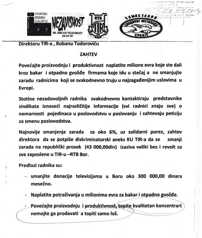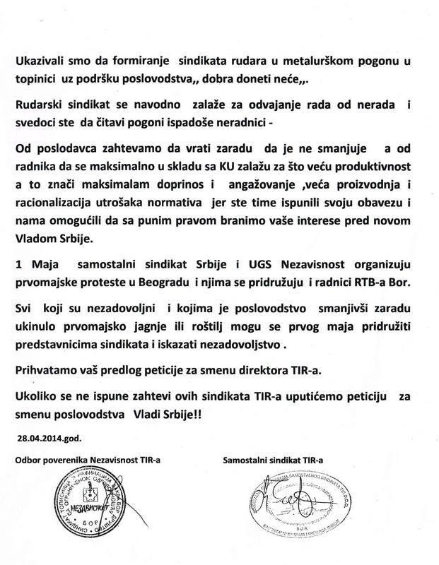 Objavljujemo originalni dopis Nezavisnog i Samostalnog sindikata TIR-a Bor dobijen pred prvomajske praznike. Smatramo da je ovaj tekst i danas aktuelan, možda više nego juče.